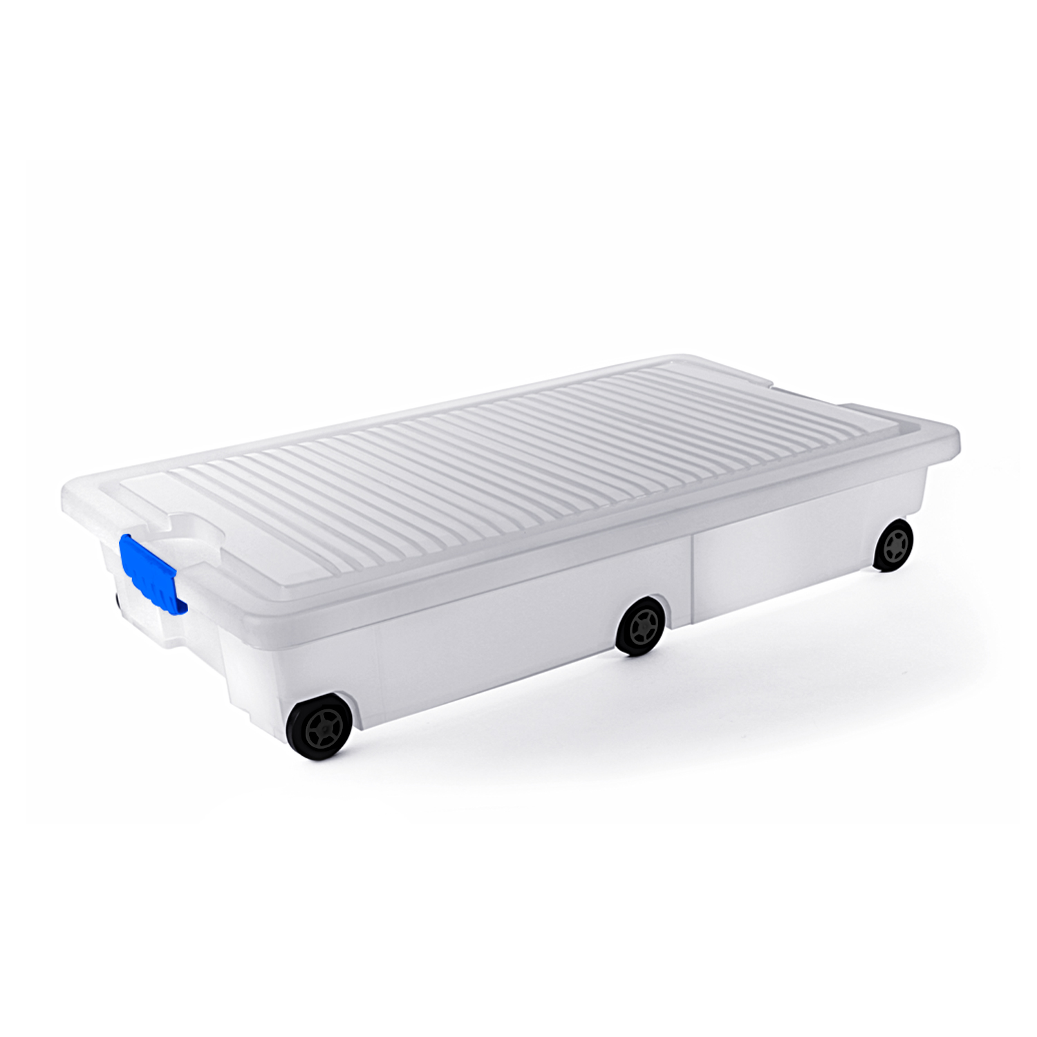 Caja bajo cama con tapa de 30 litros. Caja diseñada para caber bajo una cama convencional, permite resguardar del polvo y humedad a los artículos en su interior. Con rodos para poder moverla fácilmente.