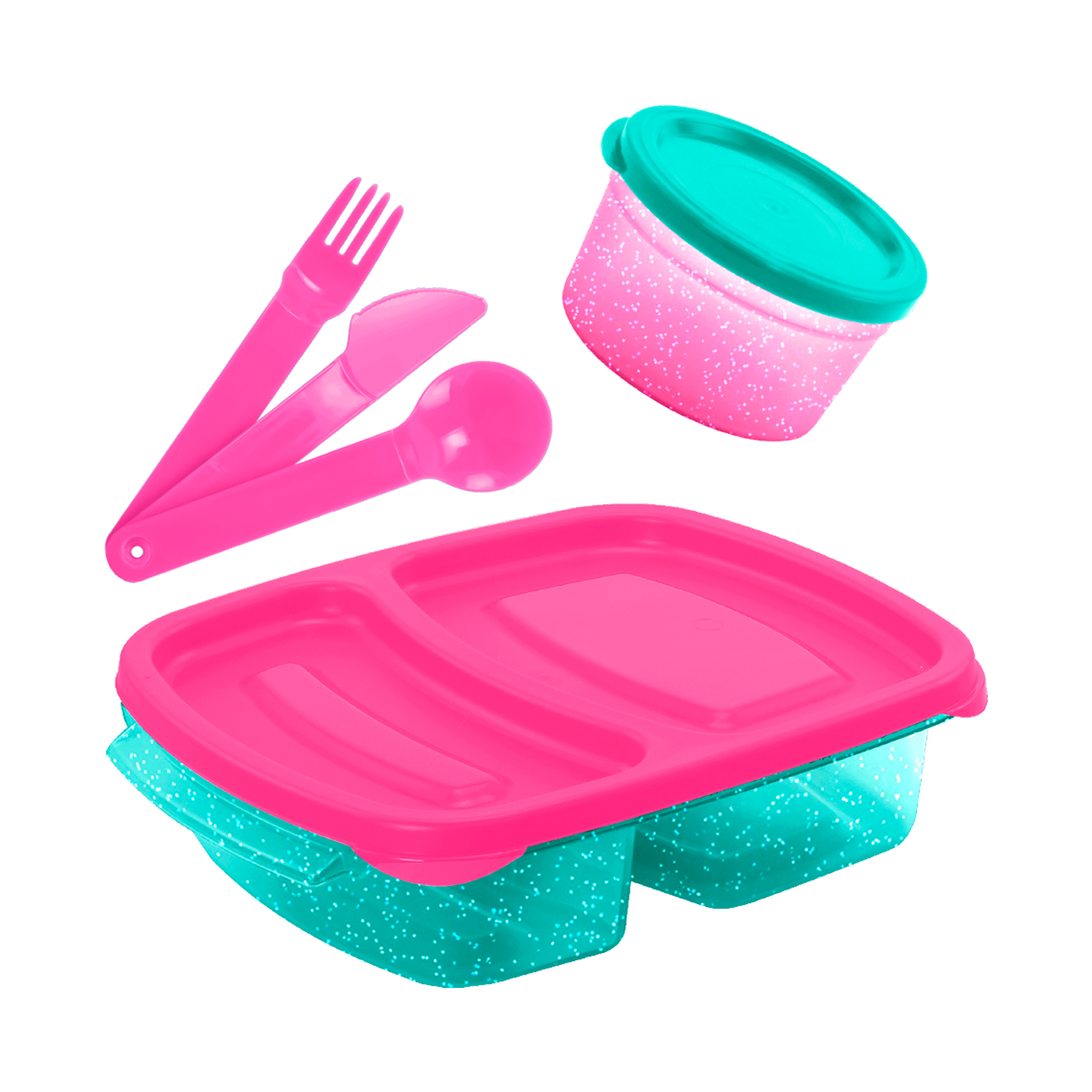 Disponible en combinaciones de colores atractivos, incluyendo versiones transparentes con glitter, este set es una opción funcional para loncheras escolares en Guatemala, tanto para uso personal como para venta al detalle o por mayor.